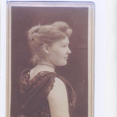 A photocopy of a photo of Anna C. Kocken, right profile, updo hairstyle, black sleeveless lace dress top, by Sperry the Artist, Commercial St., Salem, Oregon.Collection