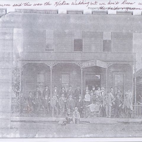 A 9 1/2" x 7 1/2" photocopy of a large group of predominantly men, dressed in 3 pc. suits, 6 women, 2 boys sitting on side walk, baby carriage in front center, toddler resting on banister in front . All are standing in front of a building with the name SVEA Hotel. Possible a Kocken wedding group photo.Collection