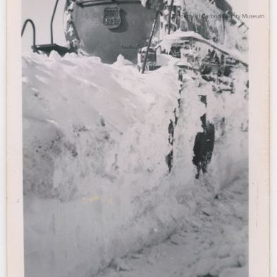 A black and white photograph, 5 3/4" x 3 1/2" taken by Frank Lujan of a train blocked by snow--on main line, just west of Rawlins of Locomotive # 3932.