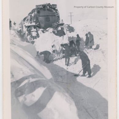 A black and white photograph, 5 3/4" x 3 1/2," of men digging out a locomotive stuck in snow. Engine # 3949.