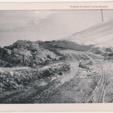 A black and white photograph, 5 3/4" x 3 1/2," of muddy ruts in a road, snow pile on left and snow bank on right. Winter of 1949 blizzard.
