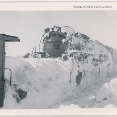 A black and white photograph, 5 3/4" x 3 1/2," of a train caboose in foreground left, locomotive #3932 stuck in snow drift. Blizzard of 1949.