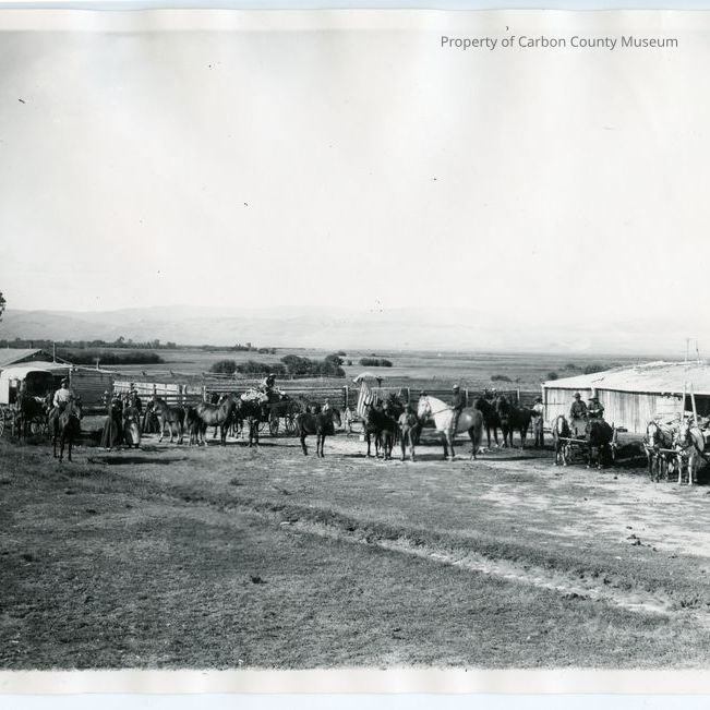 Roundup group preparing to travel. There are 4 identifiable wagons, 2 on the right and 2 on the left, with numerous horses and approximately 12 people. Most are men, but there are 3 women near the far left wagon. There are 2 wooden 1-story buildings, a long one on the right side and what may be a small cabin behind the far left wagon. A cart of some kind in the center of the photo has what appears to be a United States flag hanging on it.Collection