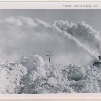 A black and white photograph, 5 3/4" x 3 1/2," of a large snowbank in foreground with an electric line/pole back left, and a railroad snow clearing machine back right. Snow shown blown up in air. Blizzard of 1949.Collection
