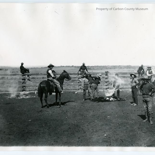 Branding cattle in a corral. There are branding irons sitting on coals on the left. To the right, 2 men on horses are restraining a roped calf with a man brands it on the side. There are several men sitting on the corral fence behind them.Collection
