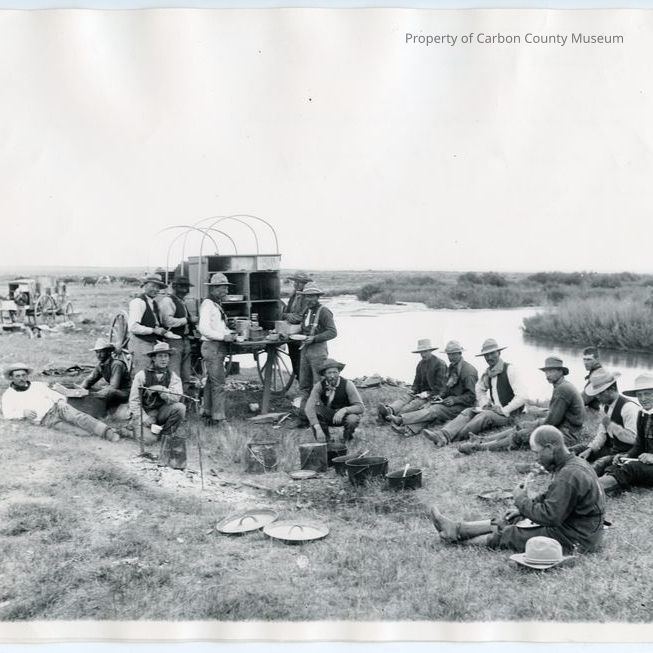 Round up scene, with men around a chuckwagon by a small river. Most of the men are sitting on the ground eating. There are 5 men gathered around the back of the wagon. A second wagon can be seen in the background on the far left. Written on back of photo: "Man sitting in center, pipe in mouth- Mike Quealey [Michael Quealy] / Third man to right of Quealey with wide brim hat know as 'Rooster'."Collection