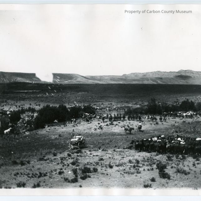 Round up scene, looking down from a hilltop. There is a herd of horses at lower right, with a loaded wagon nearby at lower center. Beyond the herd appears to be a small camp with a line of men on horses, and another herd of horses slightly behind them at right. A line of trees, possibly along a creek, separates the them from a third group of horses in the back, and possibly a corral. There is a noticeable flaw in the negative at upper left: a white spot of destroyed film along the ridge in the far background (the print is undamaged). Written on back of photo: "on Platte River between Pathfinder and Seminole / Probably 3 groups meeting".Collection