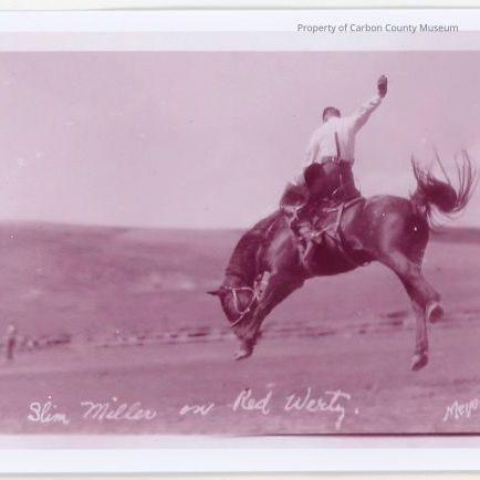 A scanned copy of a Meyers photo of Slim Miller on Red Wertz, a bucking bronc. 4" x 8" . Desert looking hill in the far background.