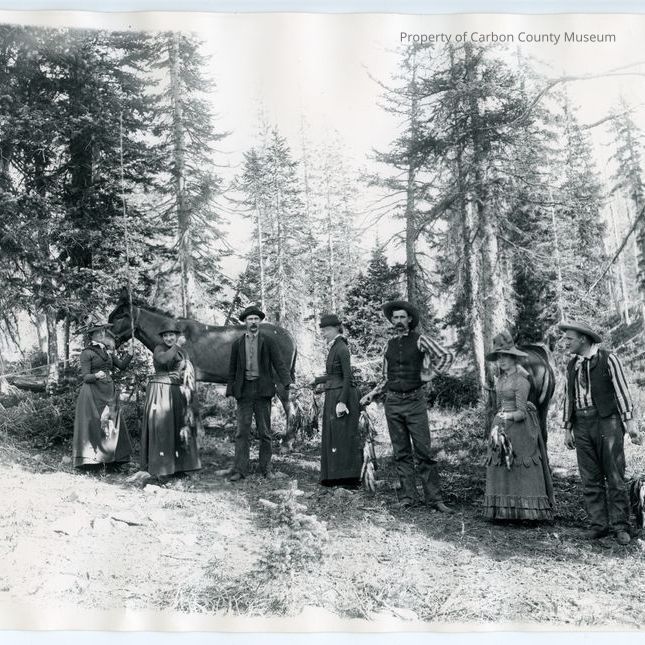 3 men and 4 women at a forest camp showing off what appears to be a large number of fish. The woman on the far left may be holding a quail or duck. There are 2 horses or mules in the background.Collection