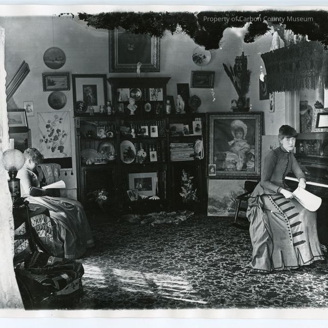 Early day parlor. 2 women are sitting in the room. 1 is on the left reading a magazine, the other is on the right, seated at a piano. Behind them against the wall is a cabinet full of books, small statues, and photos. There is a large painting of a young girl to the right of the cabinet. The top of the negative was damaged prior to printing.Collection
