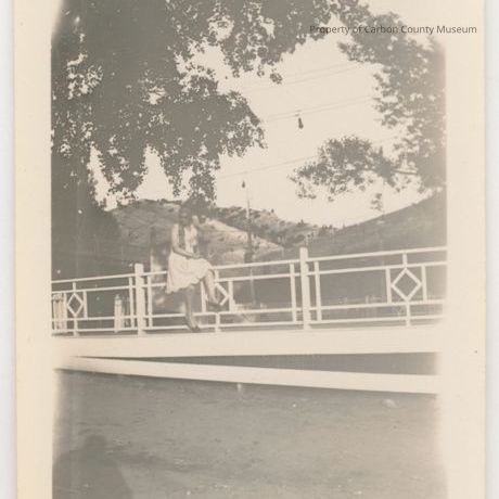 Update - 2009: Black & white print. Snapshot. Image of an unidentified woman perched on a white, decorative iron bridge railing. Trees & hills in background. Dirt road in foreground. Photographer's shadow in lower left corner. Woman is wearing a knee-length white sleeveless dress & appears to have a scarf tied over her hair - tail of scarf over right shoulder.