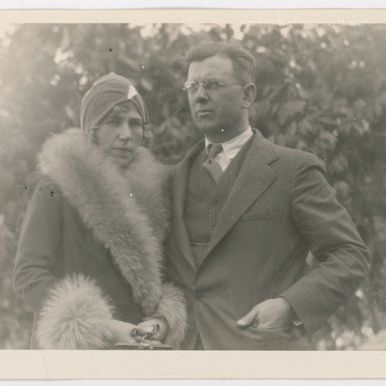 Update - 2009: Black & white print. Snapshot. Half-length image of an unidentified man & woman standing in front of trees/bushes. Man is dressed in dark 3-piece suit, medium color striped tie & white shirt; his hair is short & he wears rimless oval glasses; his left hand is in his jacket pocket. Woman is wearing a dark coat with fur collar & cuffs. She has a cloth close fitting hat on & appears to be holding a purse & gloves.