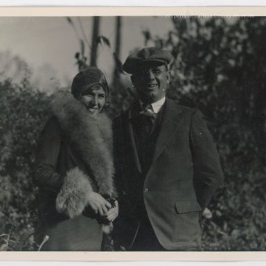 Update - 2009: Black & white print. Snapshot. 3/4 length image of an unidentified man & woman standing in front of bushes. Man is dressed in a dark 3-piece suit, dark tie & white shirt; he is wearing a cap & rimless oval glasses. Woman is wearing a dark coat with fur at collar & cuffs; she wears a cloth, close-fitting hat & is holding gloves.