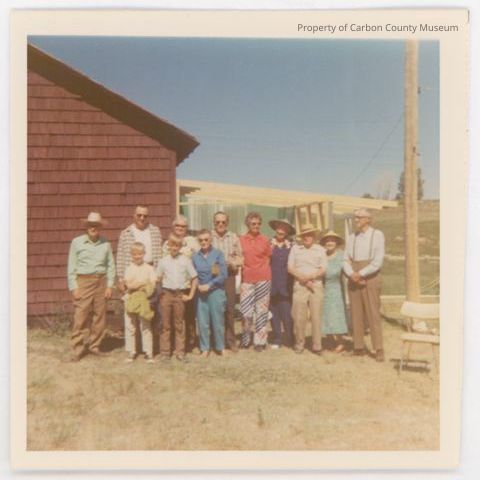 Update - 2009: Color print. Snapshot. Image of a group of 12 men, women & children posed in front of a brown rough shingle-sided building. Chair & telephone pole at right. People are all dressed in casual clothes.