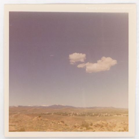Update - 2009: Color print. Snapshot. Image from elevation of a town (?) in trees on the prairie. Hills & mountains in background. Rocky ground in foreground. Two puffy clouds in sky.