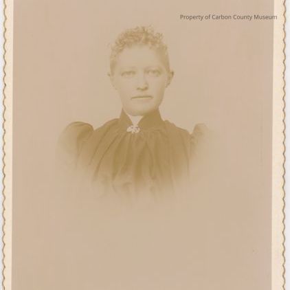 An A. A. Brown sepia toned photo of an unknown young woman ca. 1900, with light eyes, updo hair, light curly hair at forehead, faded. Upper torso face to camera pose. Tiny scallop gold border runs around the edge of photo.Collection