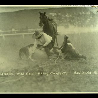 Size 12" x 14". Printed in white on original negative across the bottom "Fred Roberts, Wild Cow Milking Contest, Rawlins, Wyo. 1925." A cow is on its side in an arena and one man is lying across her head while another is straddling the cow trying to milk her. Grandstands are in the background.Collection