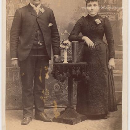 An A. A. Brown Studio sepia toned photo of a young couple ca. 1900, standing with small pedestal table between them. Both are dressed in dark clothing. The lady has an updo of dark hair, curly hair at forehead, long black dress with flower bud at left front shoulder. Gentleman is of stocky build and has mustache. Studio scene behind them. On back of photograph is written: "Lawson, lived across the street from us in Rawlins."Collection