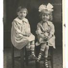 Update 2/2010: Black and white print. Studio portrait. Full length image of two young girls sitting on stools in front of a painted backdrop. Both are dressed in light colored three-quarter sleeved short dresses, striped socks and tall patten leather shoes with five button straps. Girl on right has a large white bow in her hair. Girl on left has short straight hair.