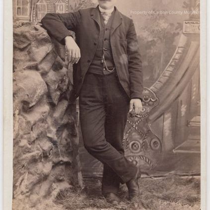 An A. A. Brown Studio sepia toned photo of an unknown young man ca. 1900, standing with right arm upon a rocky looking prop with his right let crossed in front of left leg. He is wearing a dark 3-piece suit, has medium color hair with center part and a mustache. Seems of short and stocky build.Collection