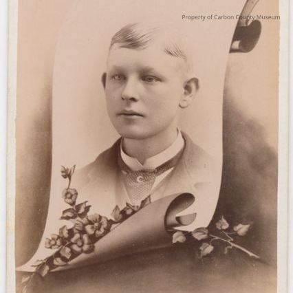 An A. A. Brown Studio sepia toned photo of an unknown young boy with light hair, lt. colored eyes, white collar, small jabot, jacket, with a scroll background and his picture is superimposed on it. Floral decoration at bottom of scroll.Collection