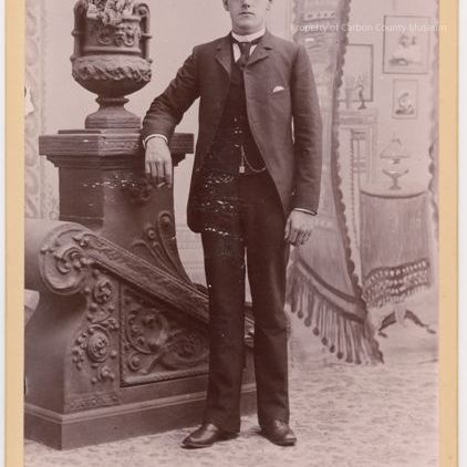 An A. A. Brown Studio sepia toned photo of an unknown man standing with his right arm propped on a large pedestal display. He is wearing a dark 3-piece suit, top hat and tie. Curtain and studio props behind him.Collection