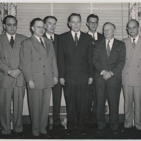 A black and white group photograph of seven United States Regional and National Solicitors, dated 12/1955. J. Reuel Armstrong is fourth from left. All are dressed in suits and ties.Collection