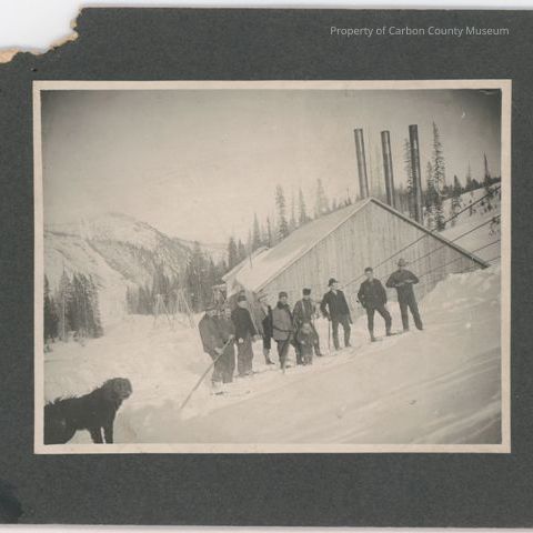A 5 1/4" x 6 3/4" black and white photograph mounted on a dark gray cardboard mat. Actual print is 5 3/4" x 5 1/4." Photograph is of a a group of men and 1 small boy and a black dog. The men are standing in the snow in front of a building with 3 smoke stacks and a tramway in the background. It is probably the Ferris Haggarty Mine Site. The donor stated that her husband's father, Fred Mathiesen, worked for the mine in Battle, WY. The group of men may be wearing skis or snow shoes.
