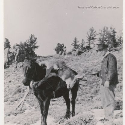Printed on postcard paper. Written in blue ink on back: "Picture of Mr. George Baker on a successful deer hunt on Six Mile close to Big Creek near Encampment, Wyo. about 1911" "Given to Carbon Co. Museum by Geo Baker Encampment Wyo".