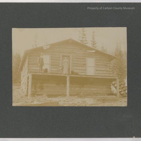 Sepia print. Mounted on black matboard. (Two (2) original prints and four (4) 3 1/2 x 4 7/8 copy prints) Image of a man, woman, child and two dogs on the raised porch of a log house. Trees can be seen in the background behind house. Man is wearing a three piece suit, white shirt and hat. Woman is wearing a long, longsleeve dress; she is holding the hand of the child; child is wearing a patterned dress and cloth cap.