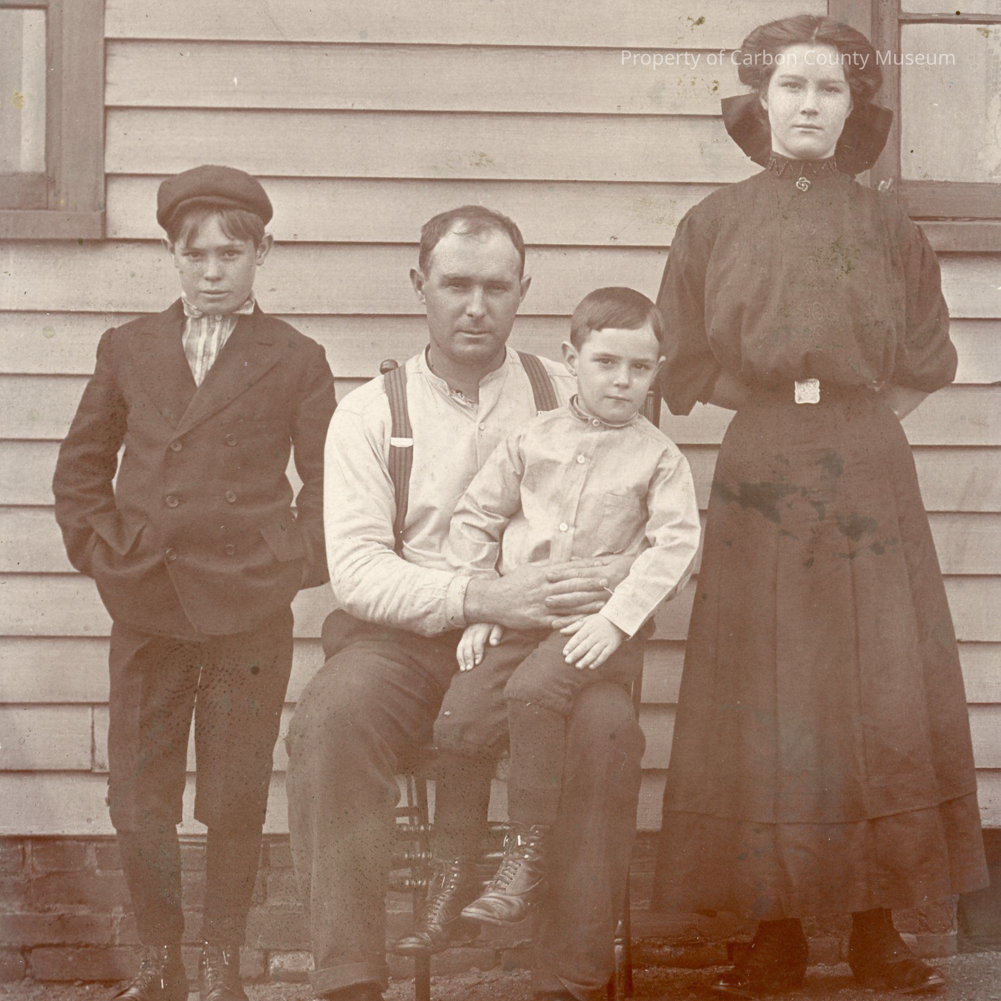 Update 2/2010: Sepia print. Snapshot. Printed on postcard paper. Unused. Image of a man, woman and two boys in front of a frame building. Woman is standing at right and is dressed in a dark dress; she has a dark bow in her hair. Man is sitting in a chair holding the youngest boy in his lap. Man is dressed in shirt sleeves; boy is in dark pants and light colored shirt. Older boy is standing at left; he is wearing a dark knickers suit, patterned shirt and cap.