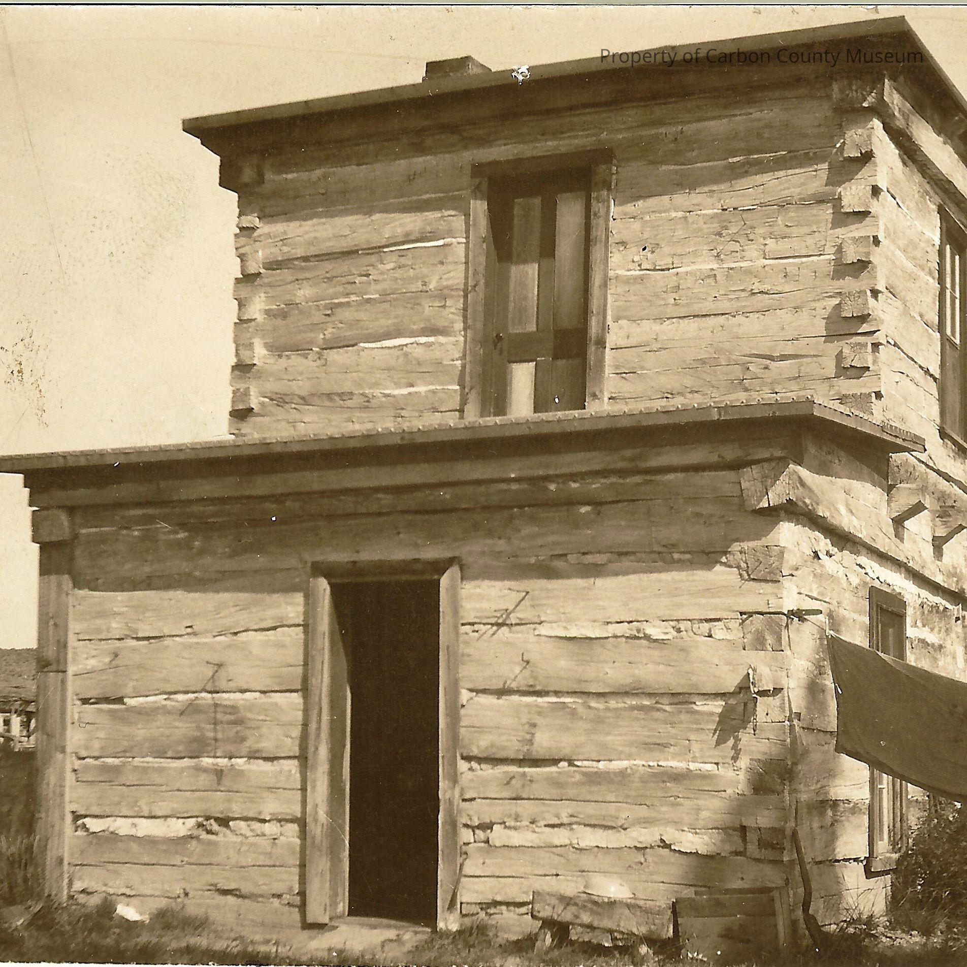 Update 1/2008: Sepia print. Image of a two story log cabin. Line of trees can be seen in the background and tall thin tree visible behind structure at left. Printed in dark margin at lower edge: "B2495 Jim Bakers Cabin near Savery, Wyoming"