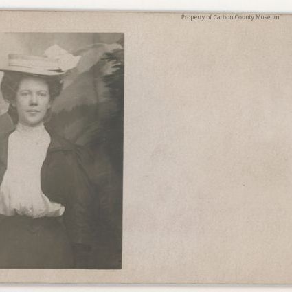 Update 1/2008: A black and white photograph printed on a postcard. Three quarter image of a woman on the left side of the card, front only. She is wearing dark colored jacket and skirt with light colored high neck blouse. Her hair is in an updo and gathered at The back. She is wearing a narrow brim flat hat with a ribbon around crown and bow to the side. Background scenery of snow covered mountains and an evergreen tree.
