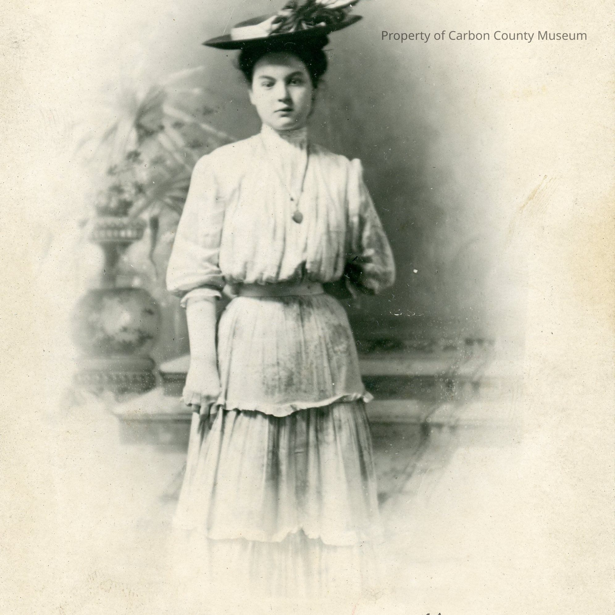 Update 4/2010: Black and white print. Studio portrait. Oval. Printed on postcard paper. Unused. 3/4 length portrait of a woman standing in front of a painted scenic backdrop with stairs and a large vase. Woman is wearing a light-colored tier dress with half-sleeves and a high collar; she is wearing light colored fingerless long gloves, a long pendant necklace and dark fancy hat. She is holding her left are behind her back.