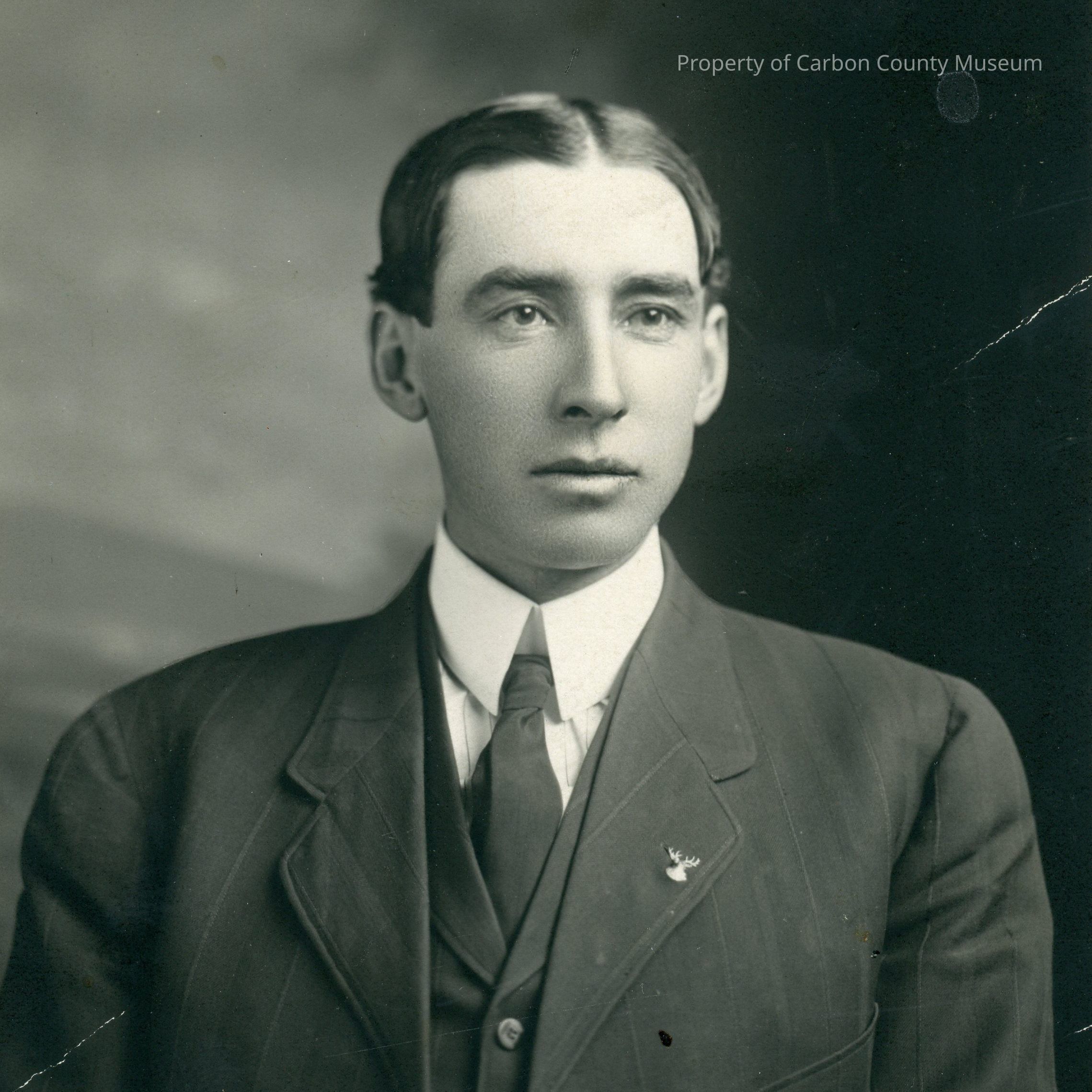 Update 4/2010: Black and white print. Studio portrait. Half-length portrait of a young man in a dark pin-striped, 3-piece suit, dark tie and white shirt with starched collar. His short hair is parted in the middle and he is clean shaven. He wears an elk heald lapel pin, and a chain-like watch fob. Painted back drop behind.