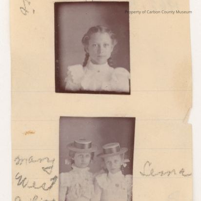 Two photographs attached to small sheet of ivory colored paper. The top photos is frontal view of a young girl with two long braids. She is wearing a light colored high top blouse with ruffle encircling bodice front and shoulder edge. Bottom photo is of 2 young girls in similar clothing as above. Their hair is pulled to the back and held with bows. They are wearing flat type hats with a ribbon encircling crown of hat.