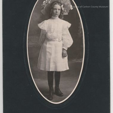 A Ferris Studio Portrait of a young girl dressed in a long sleeved white dress with ruffled bodice and high collar. She is wearing a light colored wide brimmed lace hat with small flower clusters at center back brim on right and left side. She is wearing her hair with a center part and pageboy style with a bow on the left side. Her stocking and shoes are dark. Print is oval shaped and mounted on a black cardboard frame.