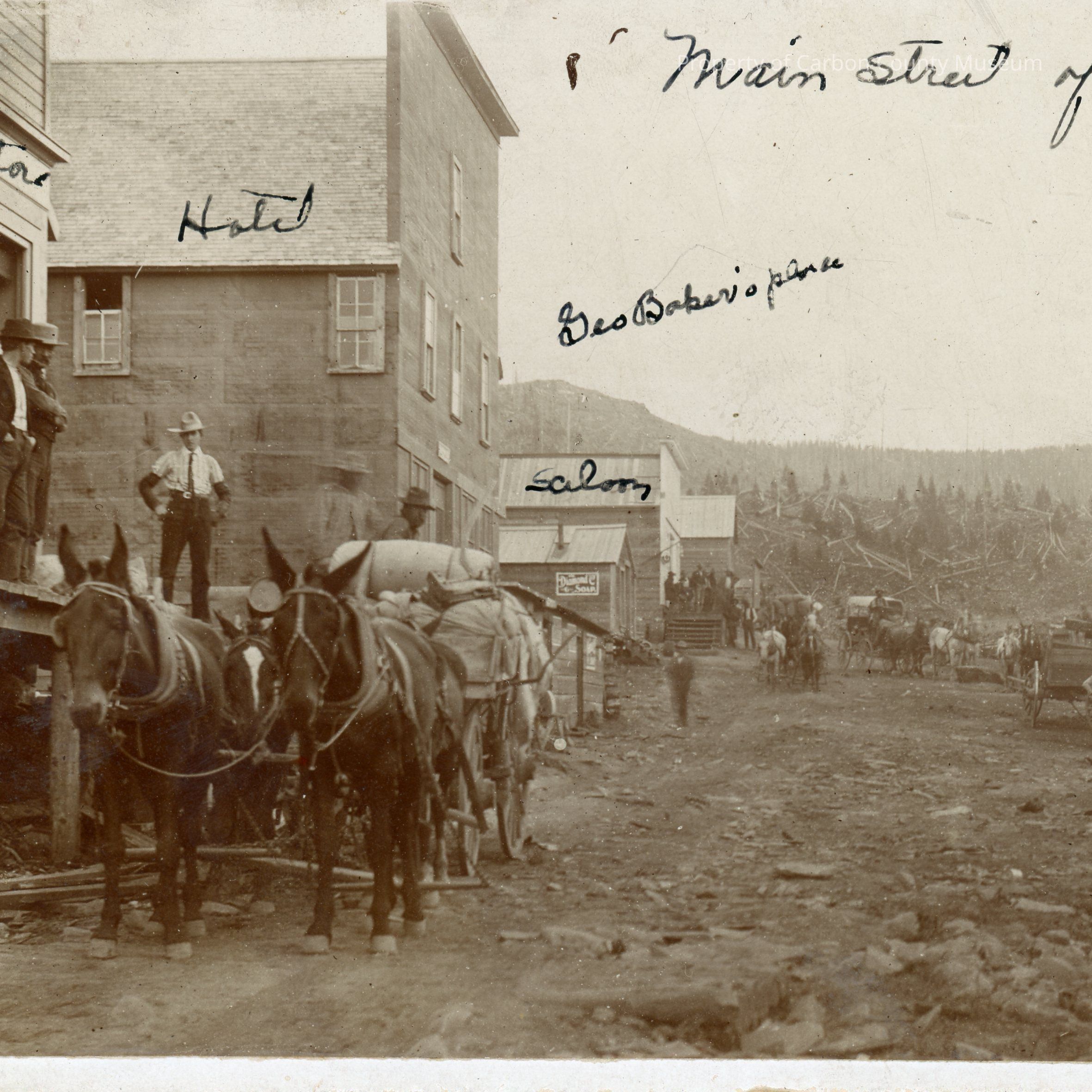 Written on emulsion surface in black ink are identification for buildings and scene: [starting from left foreground] "Store", "Hotel", "Saloon" "Geo Baker's's Place" [same building]. top center "Main Street of Dillon Wyo". Right side: "Squeazy La Marsh's Saloon".