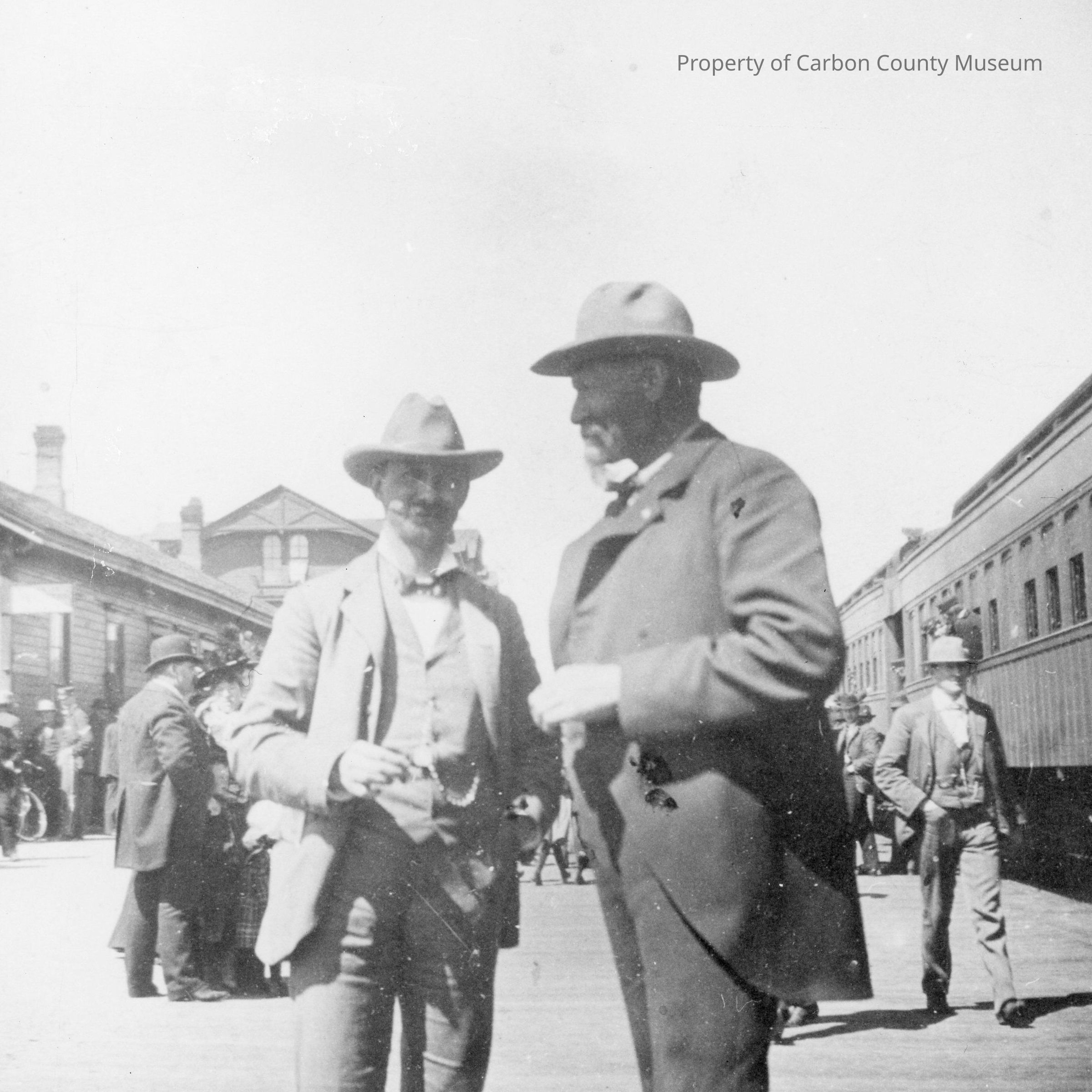 Black & white copy print. Image of two men standing by a passenger train on the tracks to their left with clusters of men and women in the background. A depot is to the back left of photo. The man on left is wearing a three piece medium color suit with chain and fob on center vest . He has his jacket open. He has a high crowned hat on and a wide mustache. His white shirt is high collared with a bow tie. Man on right is in side view and he has darker colored pants and prince Albert style jacket . He has a goatee and a mustache. A medium colored hat with brim sits atop his head.