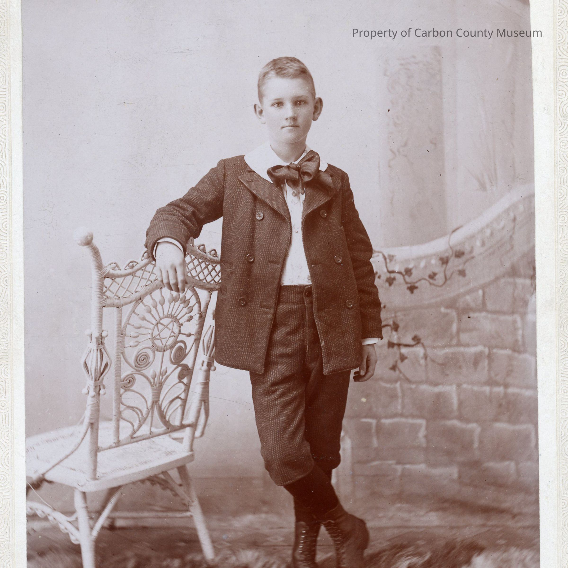 Update 2009: Sepia studio portrait. Mounted on off-white matboard with patterned edge. Full length portrait of a young boy standing with his right forearm leaning on the back of a white wicker chair and his right foot crossed over his left and resting on the toe. Painted backdrop with store wall behind; furs under foot. Boy is wearing dark knickers, dark double breasted jacket (open) dark tights, white shirt, dark scarf tie and calf high lace up boots.