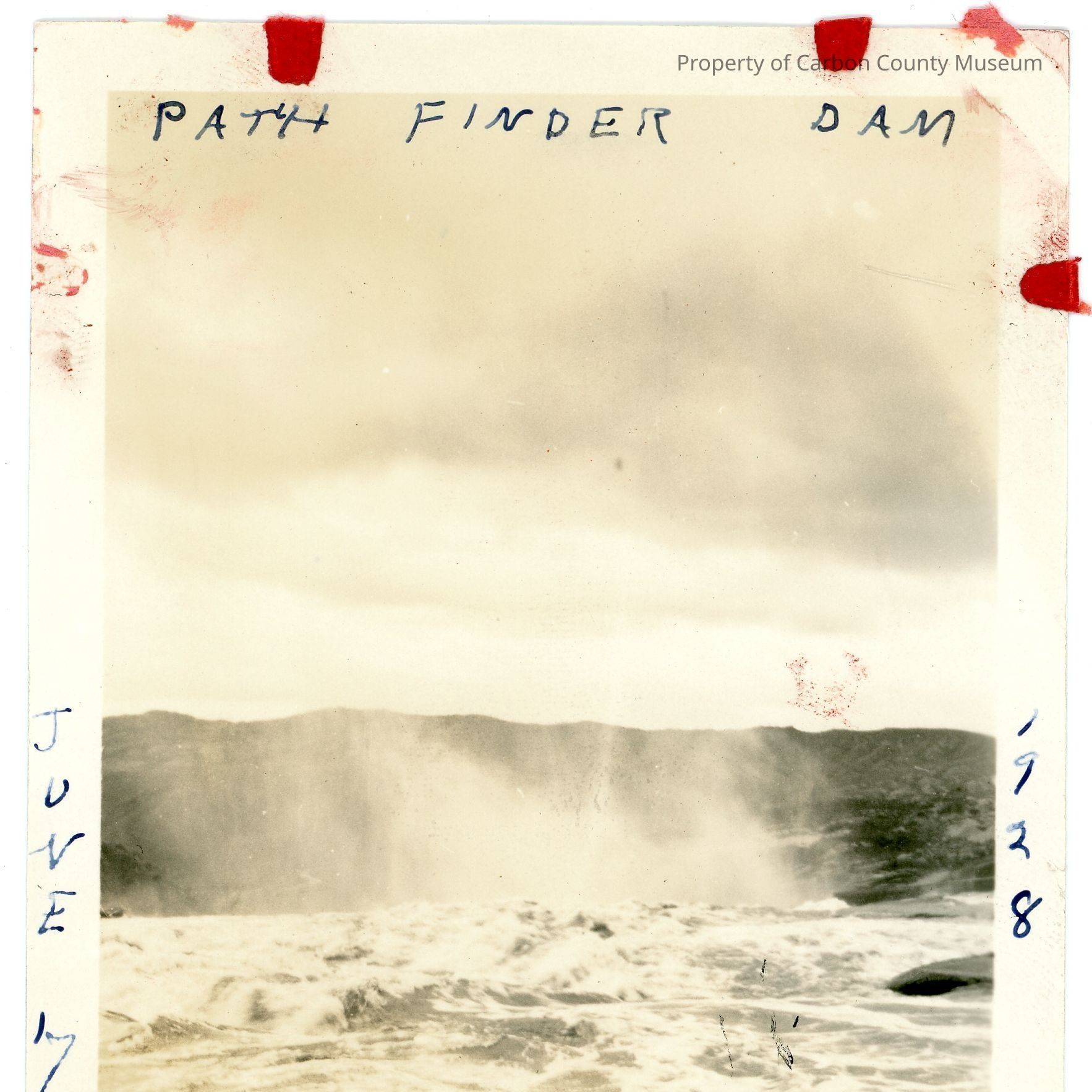 Sepia tone photograph. Rushing water. Written along the top edge of the photograph is "PATH FINDER DAM", along the bottom "FROM FOOT BRIDGE", vertically along the left "JUNE 17", vertically along the right "1928". The number 15 is printed on the reverse, also present is a circular green stamp that reads "MEYERS PHOTOS PHOTO FINISHING RAWLINS, WYO".Collection