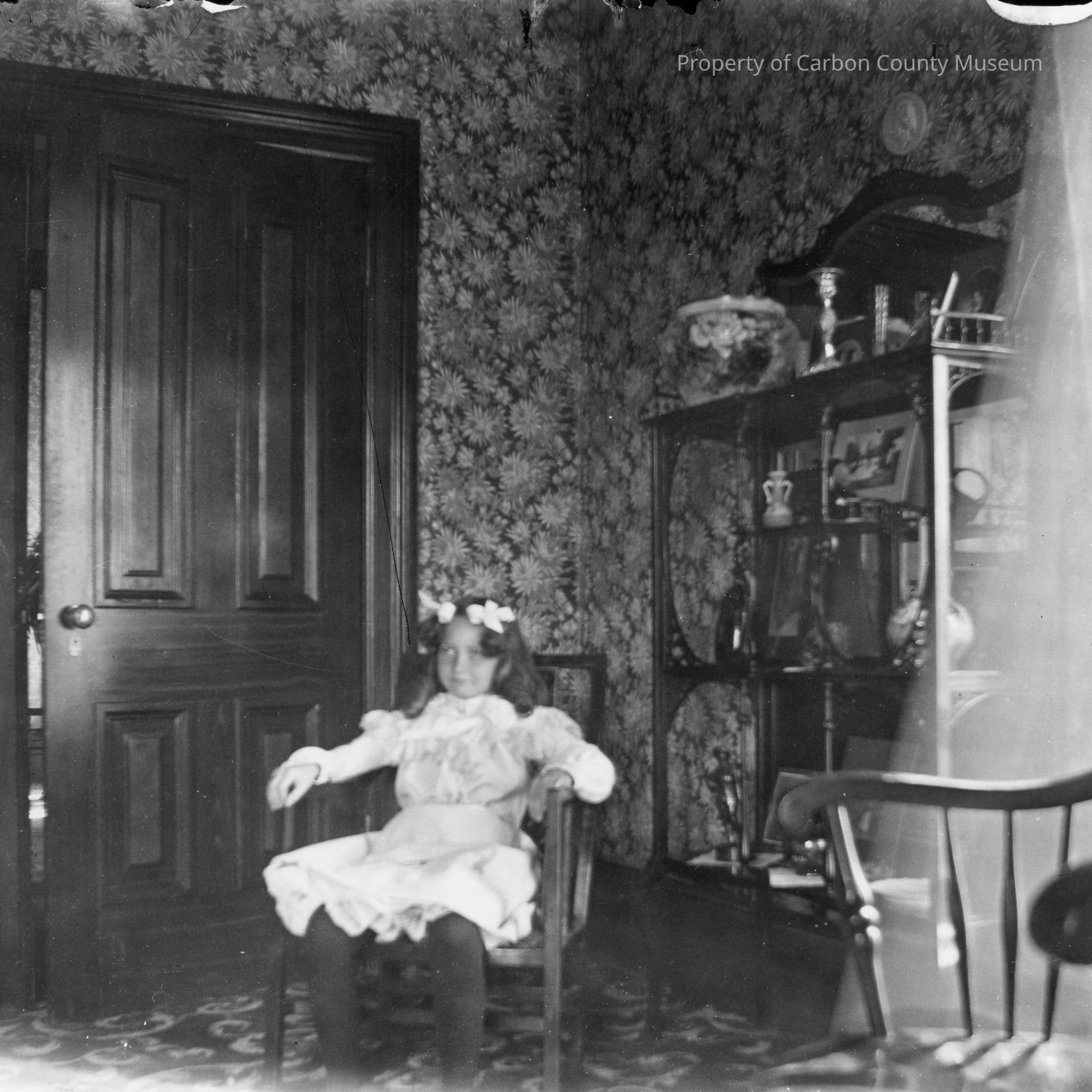 Update 2009: Black and white contact print. Printed from glass plate negative. #164. Image of a young girl seated in a wood straight-backed chair inside a house. Wood door at left; wall covered with floral wallpaper; patterned carpet on floor. Glass cabinet with knickknacks in background right. Wood rocker at front right ; window between cabinet and rocker covered with sheer curtains. Girl is dressed in frilly long-sleeved, knee length white dress and dark tights. Two white bows in her long curled hair.