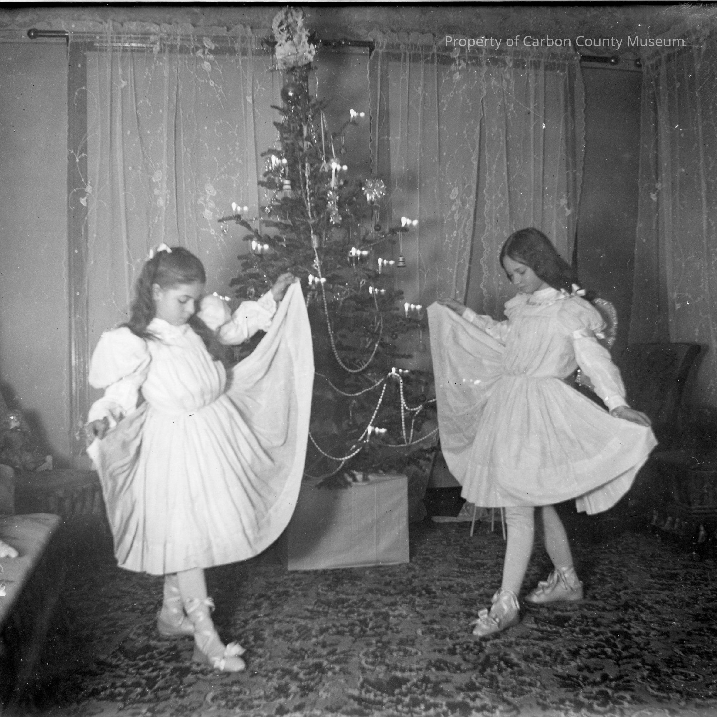 Update 2009: Black and white contact print. Printed from glass plate negative. Box 13 #124. Image of two young girls posing in a dance pose in front of a Christmas tree inside a home. Girls are both wearing knee length white dresses, white tights and ribbon tie "dance" shoes. They are each holding the skirts of their dresses out at their sides. Patterned carpet on floor; large window with sheer curtains behind Christmas tree; couch and a chair at left.