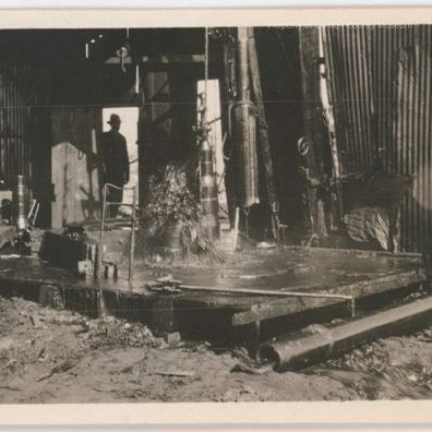 Black and white print. Snapshot. Image of a gushing oil well. Several men in suits can be seen at left and in the background. Written on the back in blue ink: "First oil well at Bairoil".