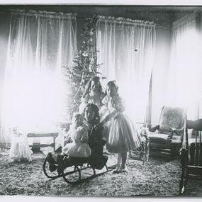 Image of three young girls posed with sled and a doll in front of a decorated Christmas tree. One girl is seated on the sled and is holding the doll. The other two are standing behind her. Seated girl is wearing a dark dress; the other two are in white. Second doll in background at left; three large windows covered with sheer drapes in background and at right . Two chairs at right; patterned carpet on floor; doll carriage and doll by chair in background.