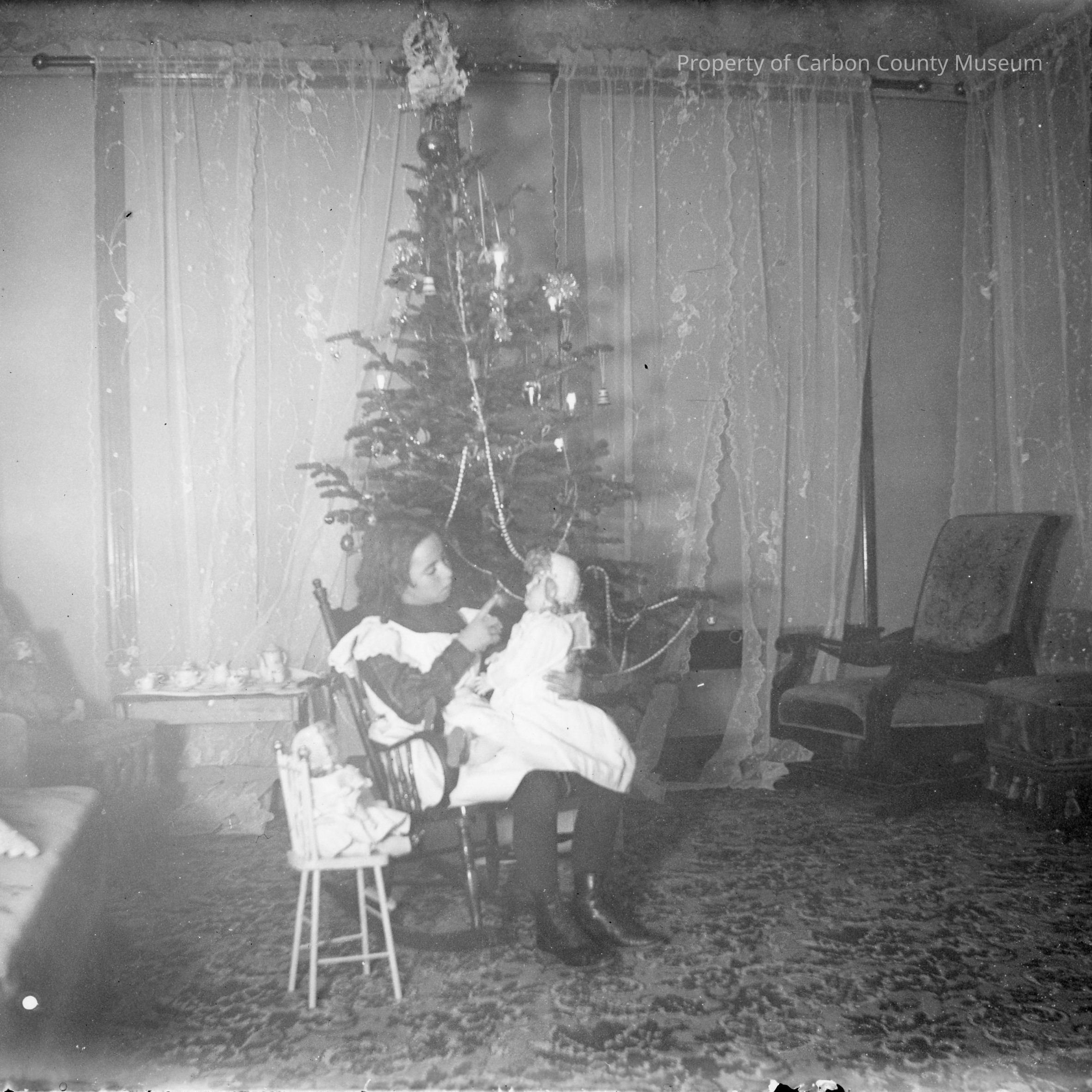 Image of a young girl seated in a wood rocker with a doll on her lap. Another doll in a high chair in foreground. Decorated Christmas tree and large windows with sheer drapes in background. Couch, chair and window with sheer drapes at left. Chairs at right. Girl is dressed in dark dress, tights, shoes and a white apron.