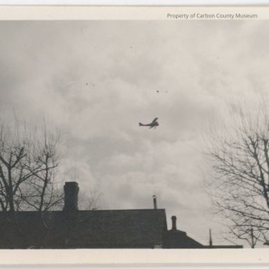 Black and white print. Snapshot. Image of a bi-plane (two winged aircraft) flying over the roof tops and trees. Trees are without leaves; sky is very cloudy-possibly winter. Roof line of a building in foreground with portions of two others in background.
