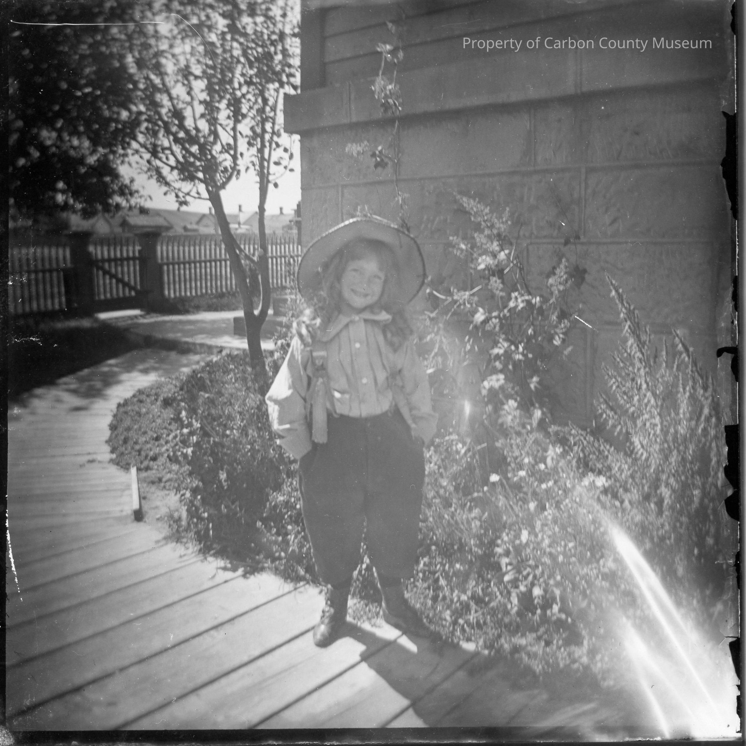 Image of a young girl standing on a board sidewalk in front of a stone and wood building. Flower garden and tree between sidewalk and building. Wood picket fence with stone gate pillars and buildings in background. Girl is dressed in dark pants, light shirt, coat and suspenders and high top button shoes. Her hair is down and curled and she has on a wide brimmed hat. She is standing with both hands in her pants pockets.