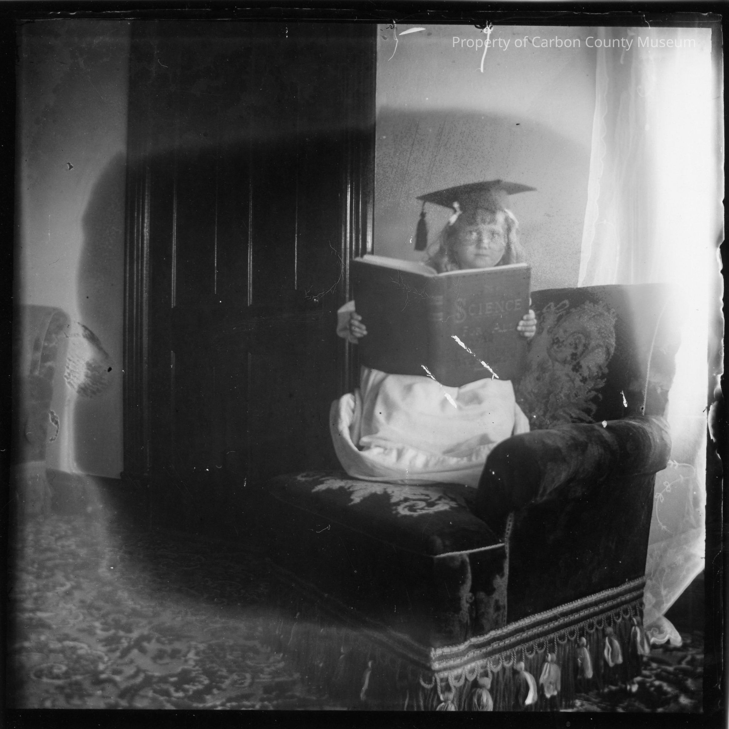 Image of a young girl kneeling in an upholstered chair. She is dressed in white with a mortarboard on her head and glasses on her nose, she is holding a large science book. Door and window with sheer drape in background.
