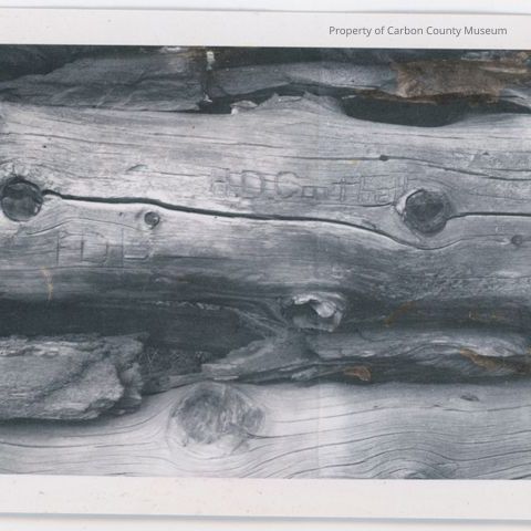 Black and white polaroid print. Image of a name carved into a log from log cabin. H.D. Corthell {See obj # 2008.1008.1.13-15). Second carving below and to the left: "FDP"